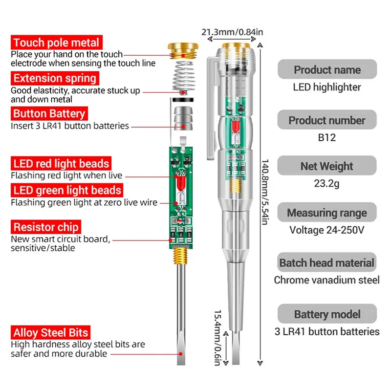 Electrical switch detection: the electric pen contacts the contact rod, if the inner core of the wire is not damaged, the LED green light will light up; If it is off, the inner core of the wire is in poor contact